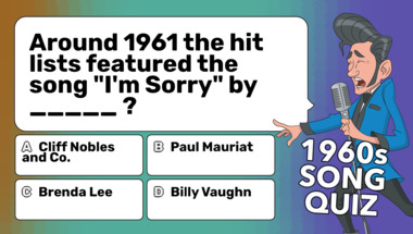 6/10 is the score to beat in this trivia quiz to put yourself over the average quiz taker. But you're probably going to be able to answer questions "Around 1961 the hit lists featured the song "I'm Sorry" by _____ ?" and "Around 1964 the hit lists featured the song "Blowin' In the Wind" by _____ ?" easy!