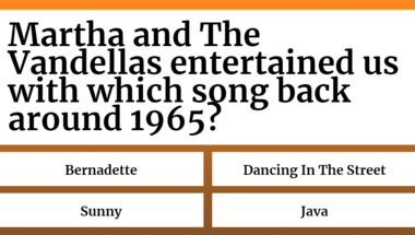 4/10 is the score to beat in this 1960s Songs quiz to put yourself over the average quiz taker. But you're probably going to be able to answer questions "Martha and The Vandellas entertained us with which song back around 1965?" and "The Beatles entertained us with which song back around 1965?" easy!