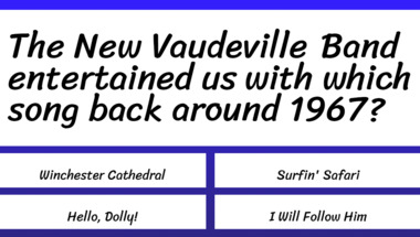 5/10 is the score to beat in this 1960s Songs quiz to put yourself over the average quiz taker. But you're probably going to be able to answer questions "The Drifters entertained us with which song back around 1960?" and "The New Vaudeville Band entertained us with which song back around 1967?" easy!